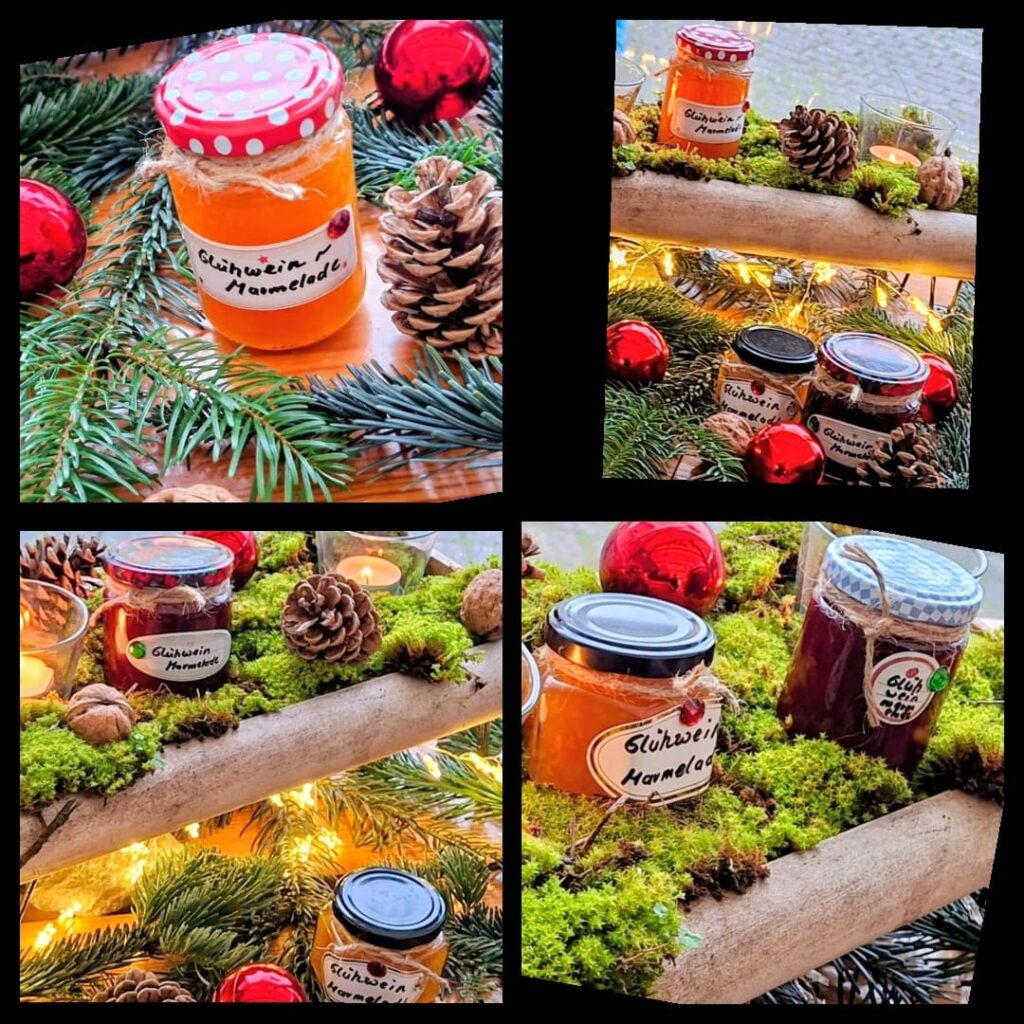 Zum anderen haben wir Glühweinmarmelade in weiß oder rot für euch kreiert. BEI JEDER BESTELLUNG AB 6 FLASCHEN gibt es die Marmelade als Geschenk dazu.